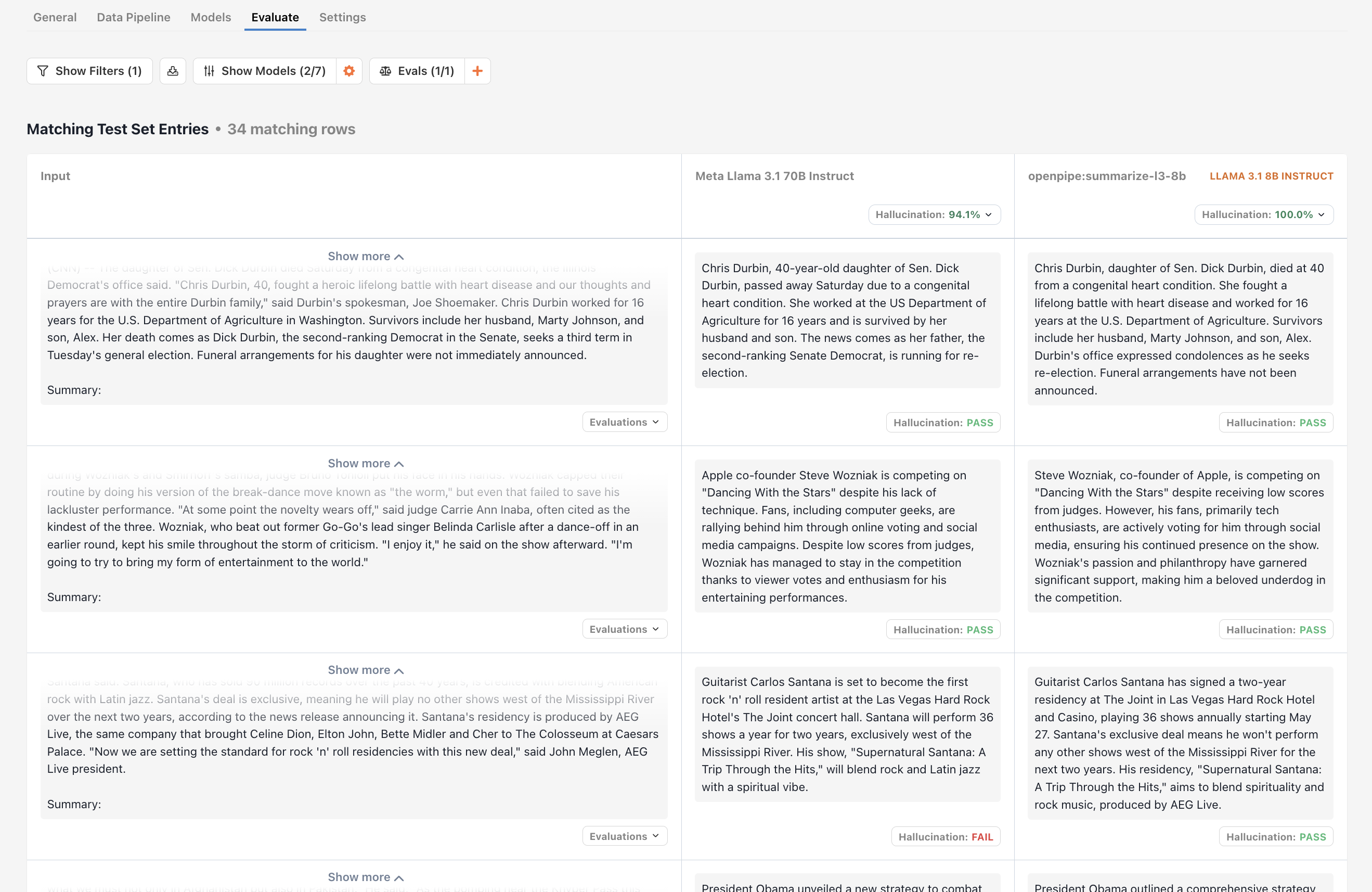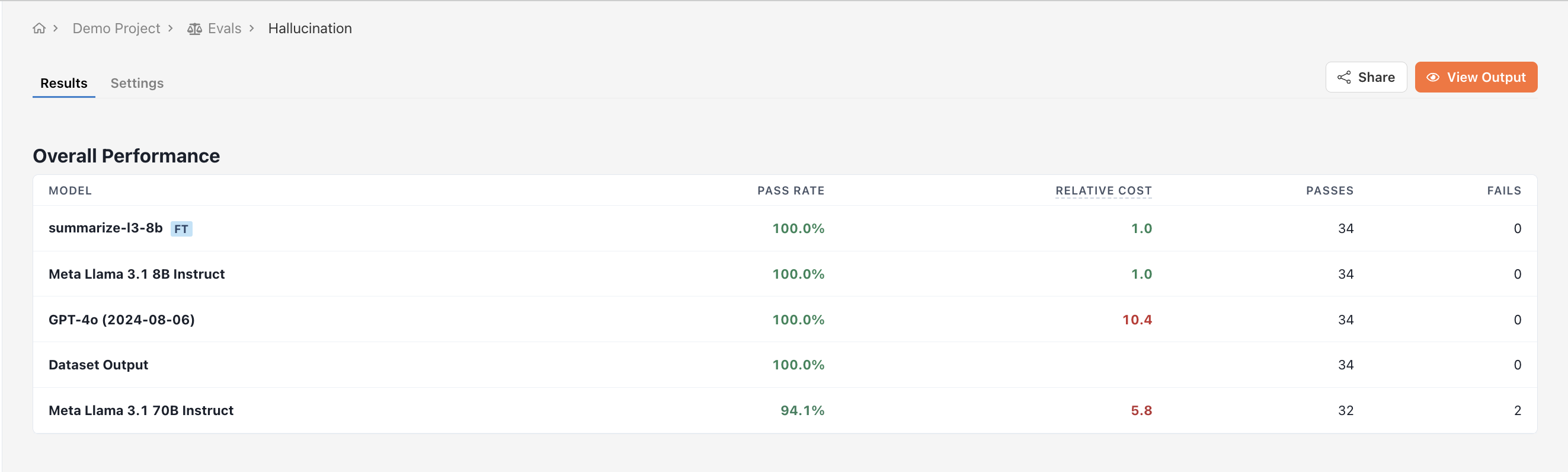 Viewing outputs side by side is useful, but it doesn’t tell you which model is doing better in general. For that, we need to define evaluations. Evaluations allow you to compare model outputs across a variety of inputs to determine which model is doing a better job. While each type of evaluation has its own unique UI, they all show final results in a sorted table.
