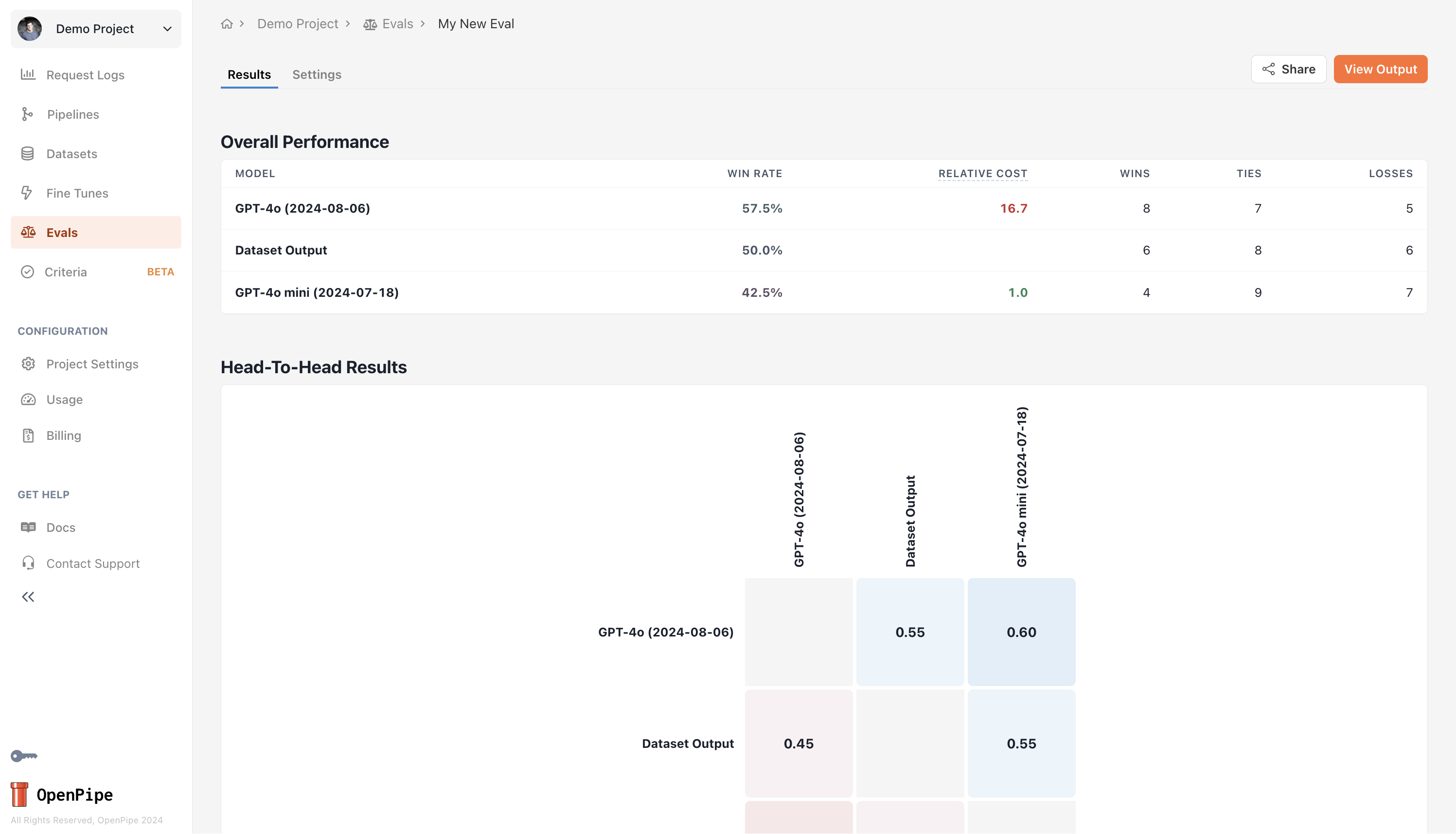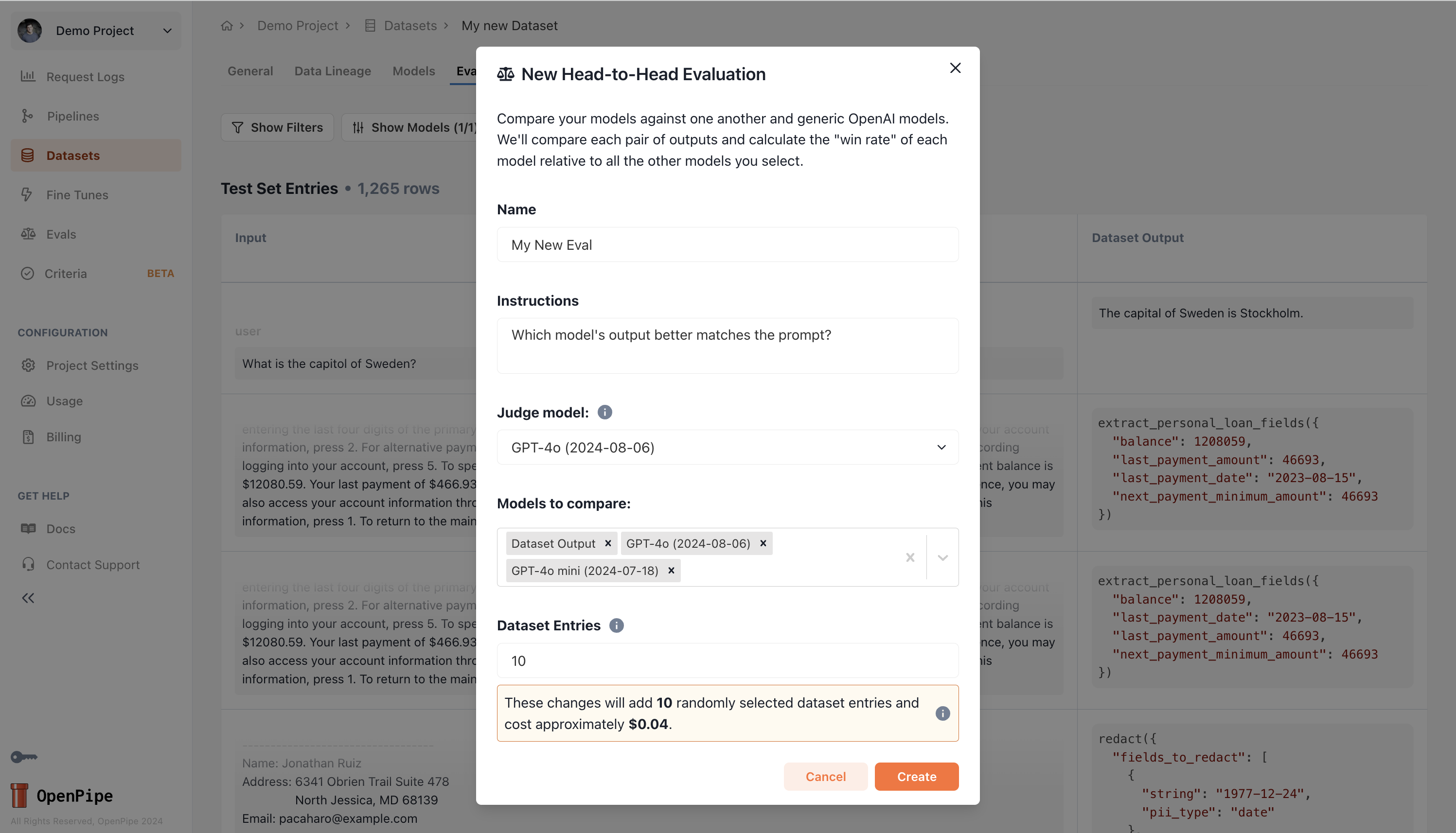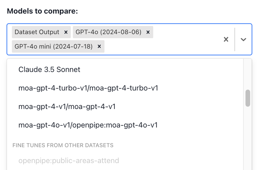 To create an eval, navigate to the dataset with the test entries you’d like to evaluate your models based on.
