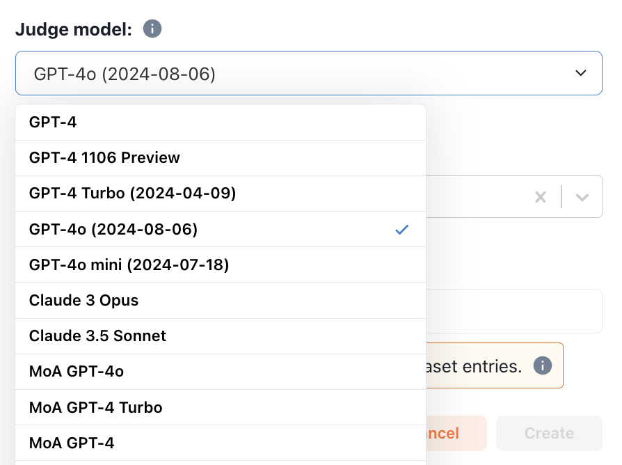 Choose a judge model from the dropdown list. If you’d like to use a judge model that isn’t supported by default,