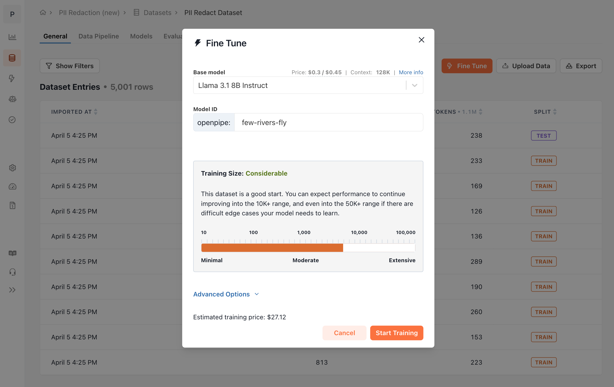 Fine tune your models on filtered logs or uploaded datasets. Filter by prompt id and exclude requests with an undesirable output.